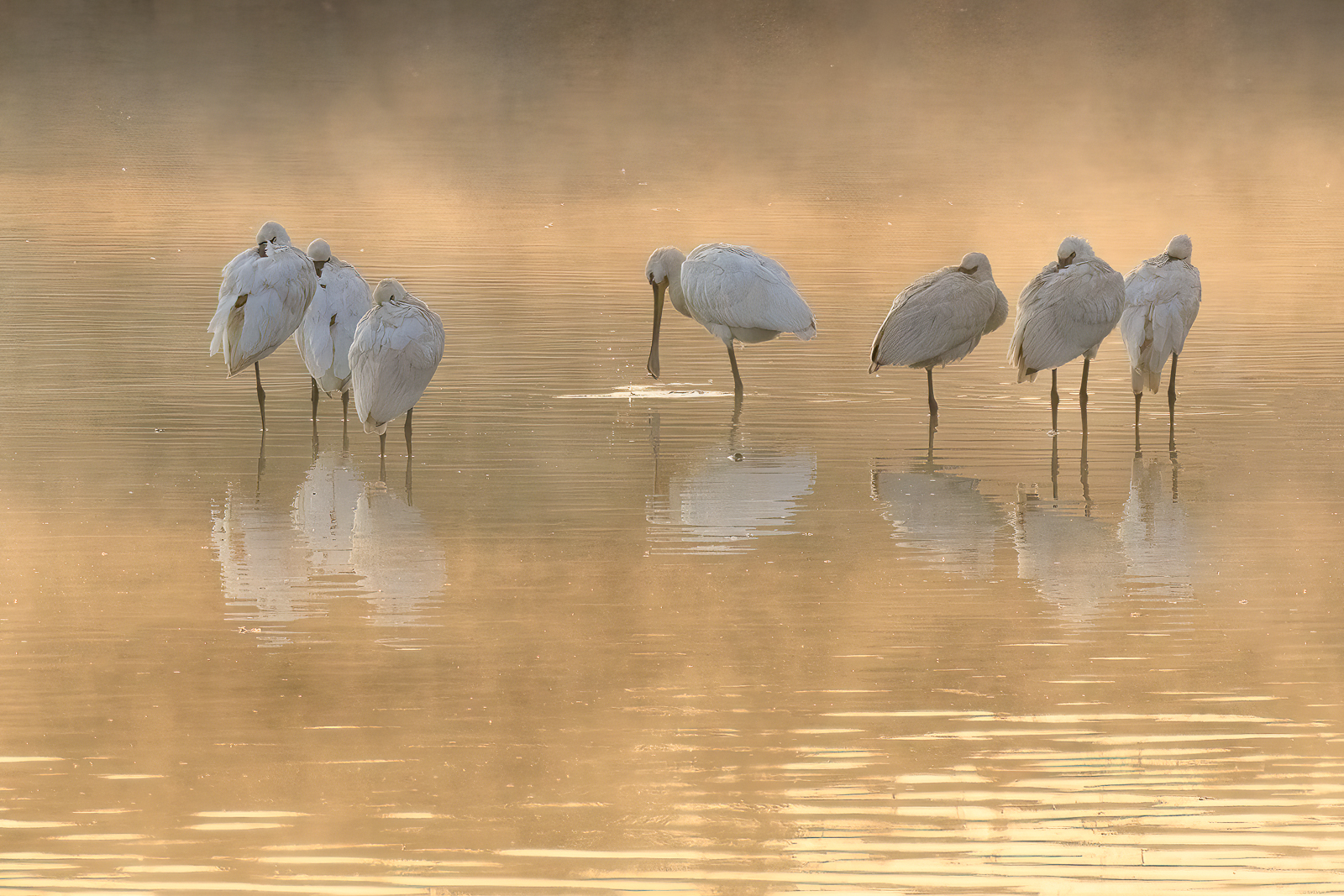 Spoonbills In The Early Morning Mist